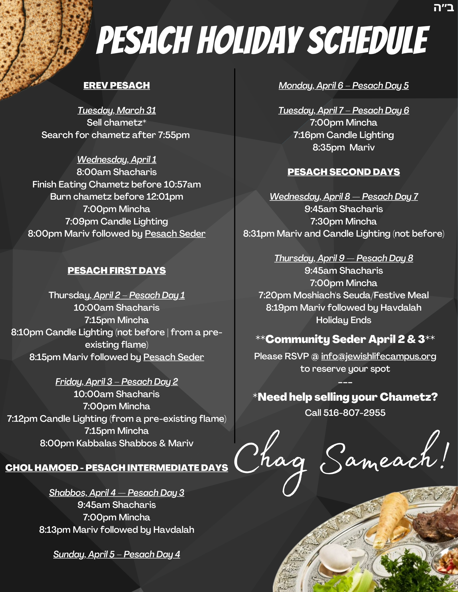 Pesach 2026 Wednesday, April 1, 2026 7:09 PM Thursday, April 9, 2026 8:20 PM Jewish Life Campus 3315 Mount Joy Avenue Bettendorf, IA, 52722 United States (map) Google Calendar ICS
